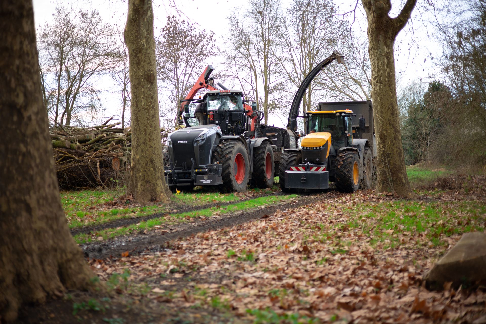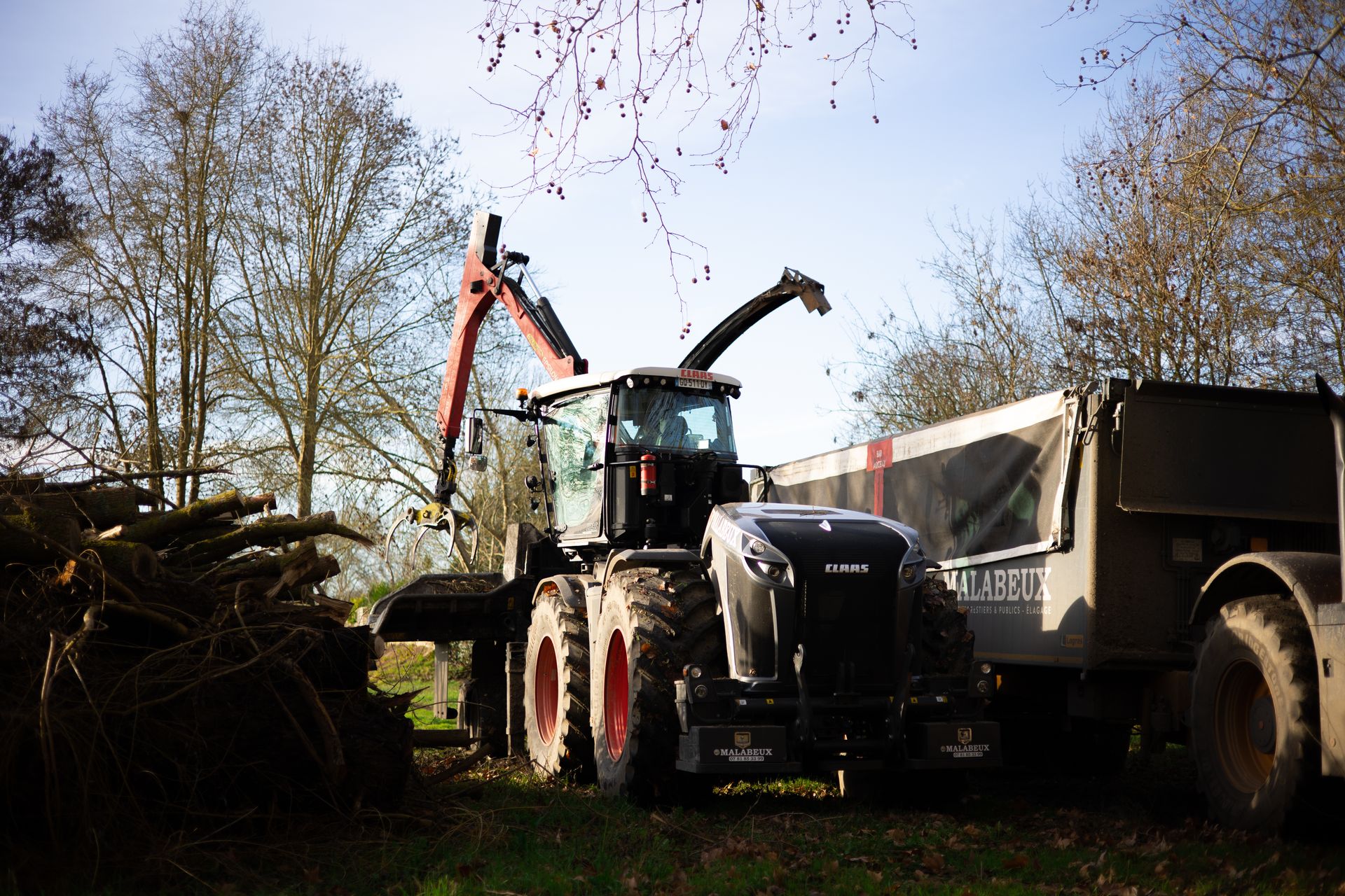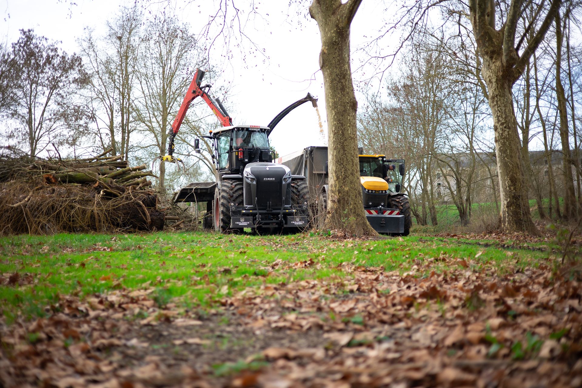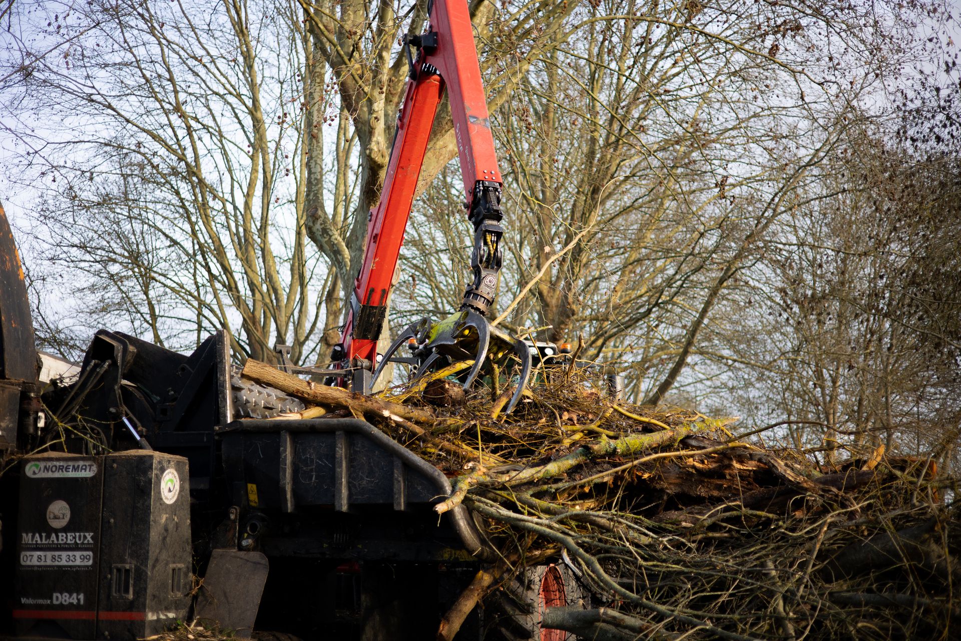 Après l'abattage et l'élagage des arbres du camping, le bois est déchiqueté et transformé en plaquette forestière. Il sera envoyé en chaufferie par la suite.